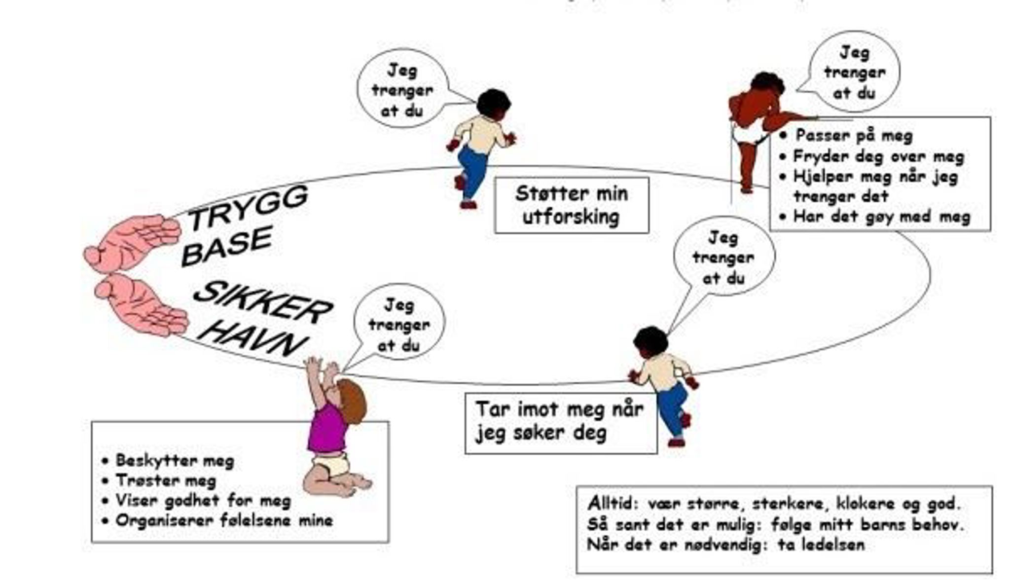 Trygghetssirkelen handler om at vi voksne, enten vi er ansatte eller foreldre, skal være barnets hender, en trygg base å komme tilbake til og en sikker havn når det stormer rundt. Vi skal bære de, støtte de, hjelpe de til å oppdage og utforske verden på en trygg og god måte. Vi skal være der å ta imot når de trenger trøst, trygghet eller bare et fang, og vi skal være der som støttende stillase i deres utforsking av omverden rundt seg og i livet de lever. De skal vite at de kan komme til oss når de trenger et ekstra blikk for å skli ned sklia, eller de trenger en trygg og god voksen for å stå i vonde følelser når mamma/pappa har reist på jobb og savnet blir for stort.